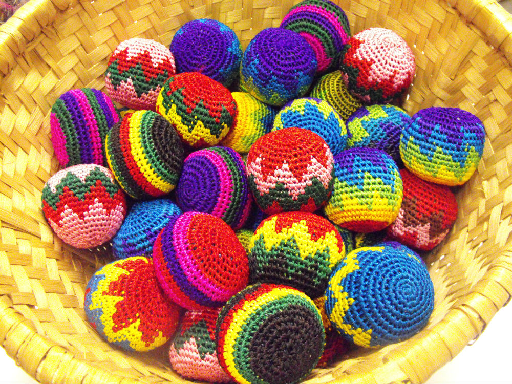 These wonderfully tactile colourful hacky sacks have just arrived from Nepal. They have a cotton outer and are filled with dried chickpeas and are a great weight for playing hacky sacks.