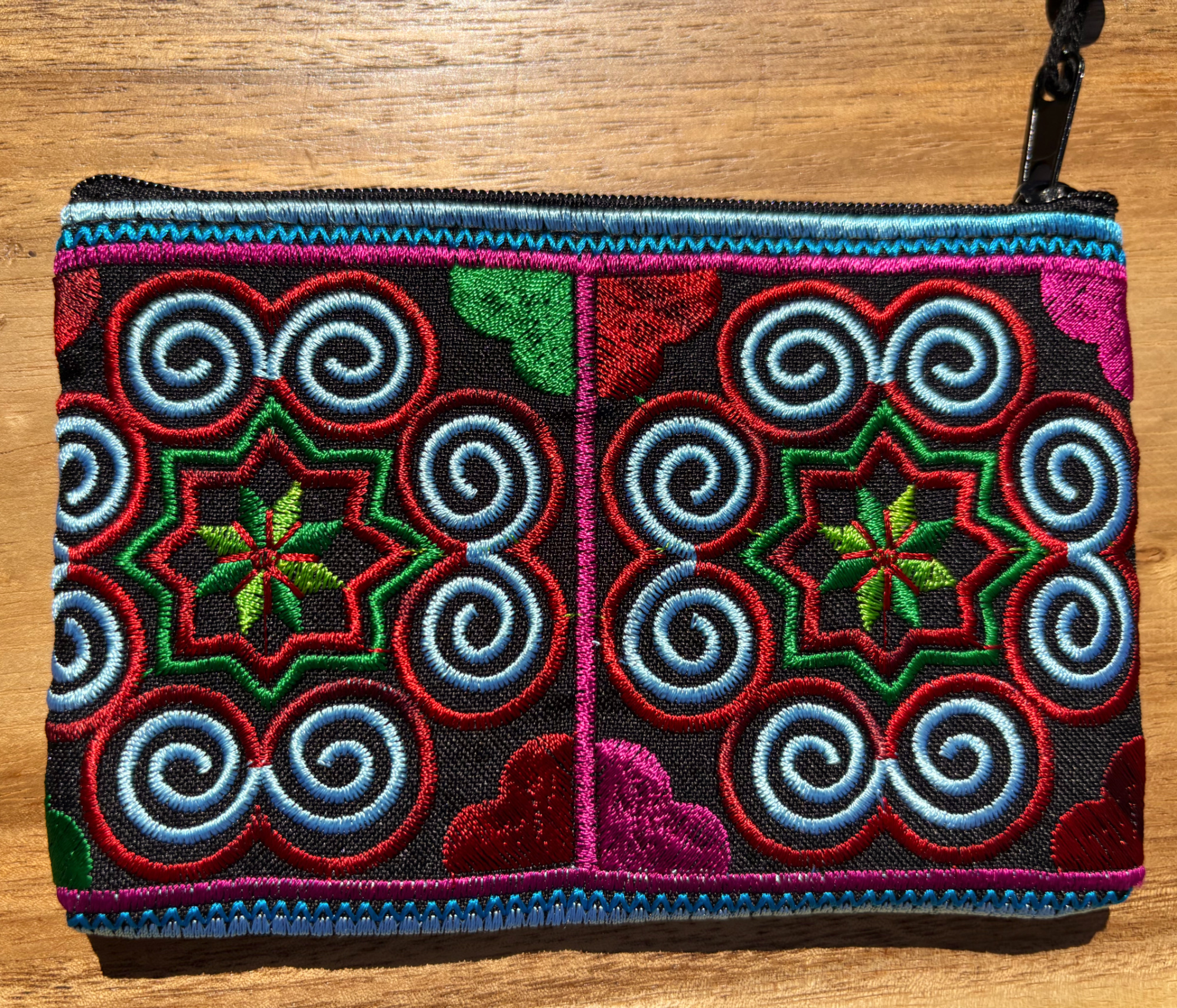 Our Akha Spiral Hill Tribe Purses come in Pink, Green and Blue Colours, they measure 13 cm by 9 cm and are lined and fastened with a zip.