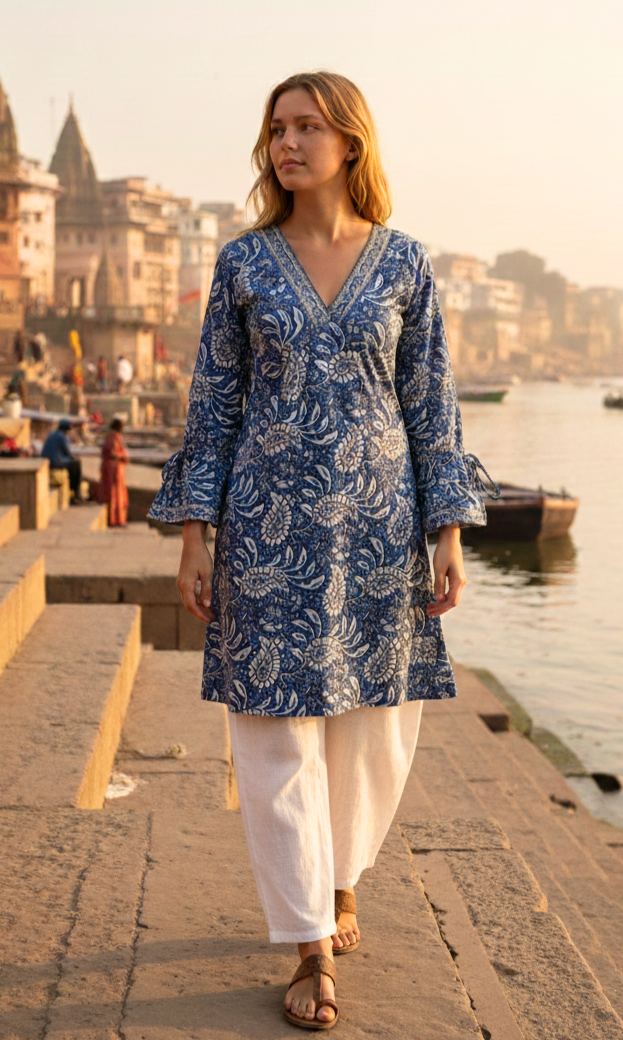 Paisley Print Kaftan Top Soft Indian Cotton Block Print Blue Sizes 8 - 16